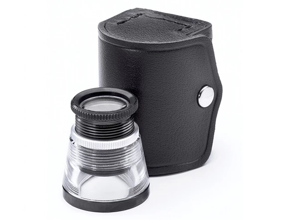 Excellent for determining paper quality and ink absorption. Ideal for proofreaders. The transparent acrylic base rests directly on work for clear, close-up examinations. Base admits light to subject under view. 12X is Kellner-type, color-corrected, three-element lens system. Twist focus with lock-ring for permanent setting. Contact reticle adapter ring on base accepts all 27mm diameter reticles. Since power increases as field of view decreases, the full reticle pattern of some crowded reticles will not be visible using the 12X comparator. Nylon case (#36-286) is sold separately.