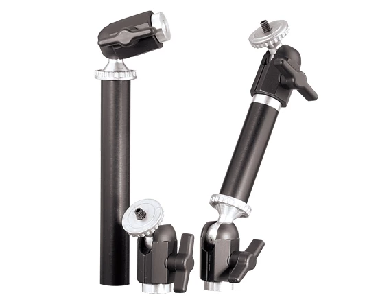 Articulating Arm Mounting Systems are designed to reach into areas not easily accessible with standard ¼-20 mounting. These “arms” can be positioned in any angular setting (180°) via the ball-pivot assembly. A total 360° rotation can be achieved by tilting/turning the knuckle about the shaft. The position can be locked with the easily handled knob or the tamper-resistant set screw (Allen Key included). Articulating Arm Mounting Systems can be used for applications ranging from mounting optical assemblies to fixturing cameras. Individual components are available, as well as One-Arm and Two-Arm packages. The One-Arm package includes two knuckles and one shaft, and the Extended One-arm package includes three knuckles and two shafts for added reach and range. Our Two-Arm package includes four knuckles and two shafts for separate arm requirements, such as alignment of dual branch fiber optic light guides. Nylon washers are provided with knuckles to avoid scratching anodized surfaces. Additional optical bench hardware set screws (not included) are available.
