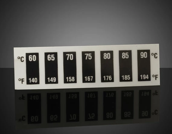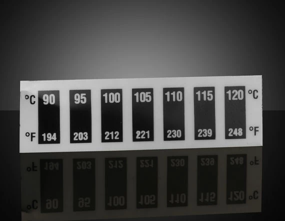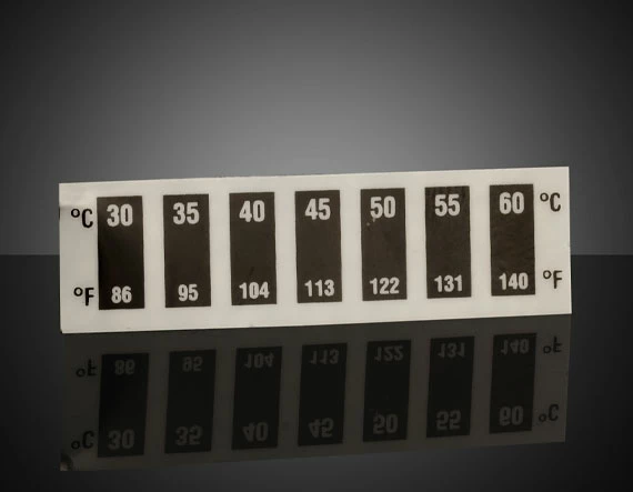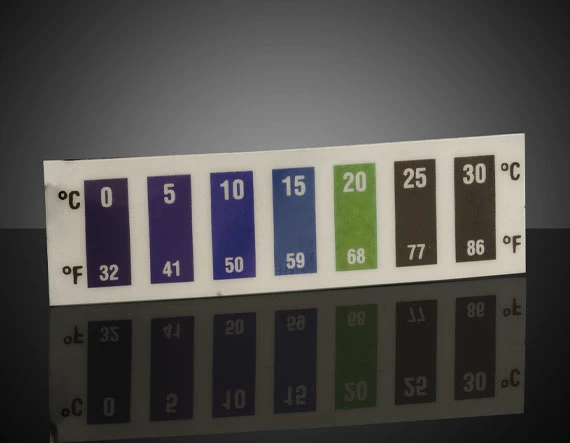 Liquid Crystal Thermometers are self-adhesive temperature indicators with instant response that provide a continuous readout of temperature. These thermometers are divided into 7 elements, each corresponding to a 5 Celsius degrees increment of their specified temperature range. Each element changes in sequence of orange to yellow (below specified temperature), green (at specified temperature), and blue (above specified temperature). Liquid Crystal Thermometers are available with 30 Celsius degrees temperature ranges between 0 to 120°C and are ideal for drying, curing, process control, or general temperature monitoring applications. These thermometers are reversible and will change color in opposite order (blue, green, yellow, orange) as temperature decreases.