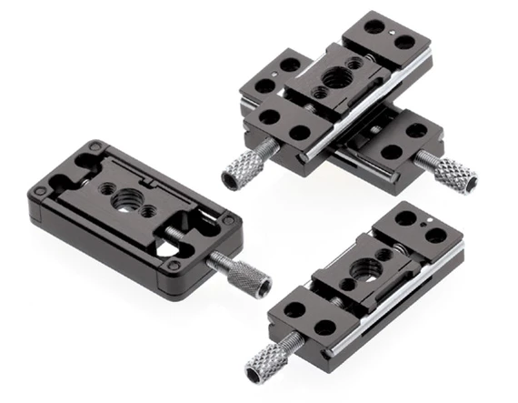 These stages are a dimensional breakthrough and the smallest positioners available today. Positive spring loaded carriage provides precise, smooth motion with no backlash. Straight line accuracy under 2 microns. Features fine 80 TPI lead screw drive. The larger series, Stage Size B, are for longer travel, higher load applications. Fully metric compatible clearance holes. Covered Rail versions are slightly wider, but offer protection for the guide rails. Accessories allow for mounting our precision pinholes for spatial filtering applications. Anodized aluminum construction with stainless rails.