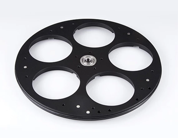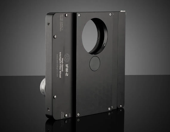 Two interchangeable filter holders are available for the Motorized Filter Wheels. The 8-position holder can accept up to eight 25mm and 1″ diameter filters that are up to 5.5mm in thickness. The 5-position holder can accept up to five 50mm diameter filters that are up to 5.5mm in thickness. Each filter holder can be easily removed from the Motorized Filter Wheel without the use of tools. A hinged door is secured by a single captive thumbscrew; once opened, the filter holder can be extracted and another inserted in its place. The filter holders include an assortment of 0.75mm and 1.5mm thick spacers to accommodate different filter thicknesses. Each filter is held in place by two easily removable plastic tabs.