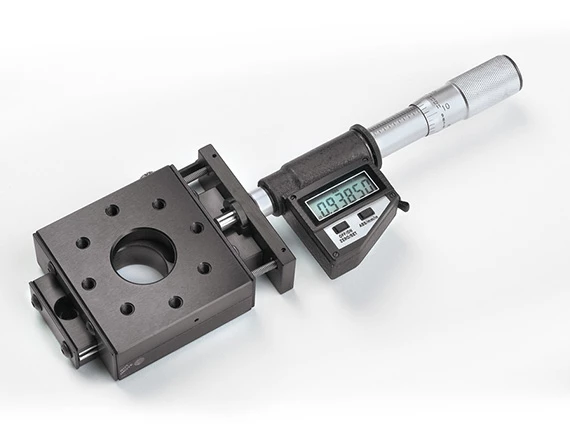 Available with standard (English) or metric mounting holes, these digital micrometers have a precision ground mounting surface and clear LCD readout. The micrometers also feature incremental or absolute positional modes, zero set at any position, inch or millimeter readouts (0.001mm resolution), display hold, and automatic shutdown to conserve the integral battery. Stage travels are one inch and table tops are available with or without a thru-hole.